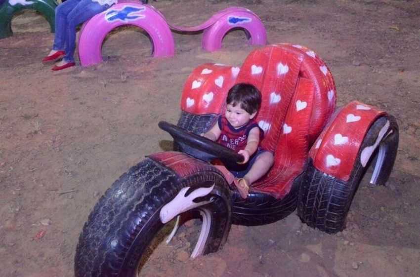 Интересно, что с самого детства, у детей зарождается интерес к механизмам. При таком раскладе, чтобы не бояться, что малыш залезет, куда не следует, стоит создать для него аналогию, счастью не будет предела. Так, как раньше мастерили лошадок деревянных, сейчас из устаревших шин мастерят детские машины. Представим ниже 12 супер идей для детской площадки из покрышек.