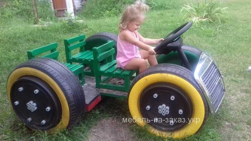 Отличная машинка из покрышек, с такой справится даже самый неуемный ребенок.