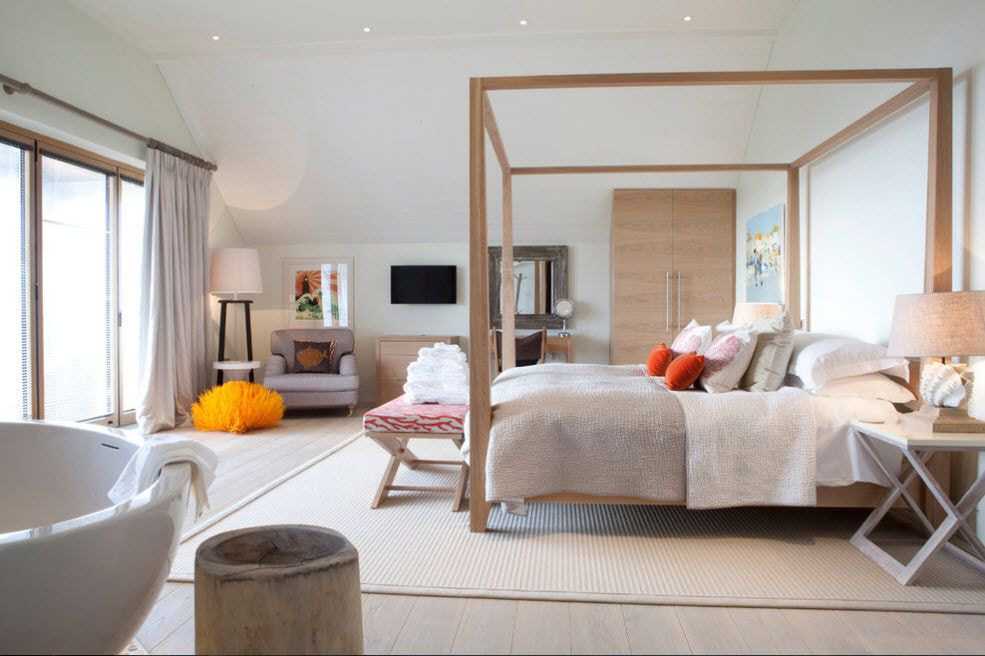 Дополните образ полками, светлыми аксессуарами, перламутровыми занавесками. Если вы любитель холодных северных течений, этот вариант также соответствует вашему вкусу. В этом случае в качестве дополнительных деталей выберите голубые занавески, подушки той же гаммы, деревянные или каменные статуэтки. Стены покрасьте синим, голубым, белым или серым.