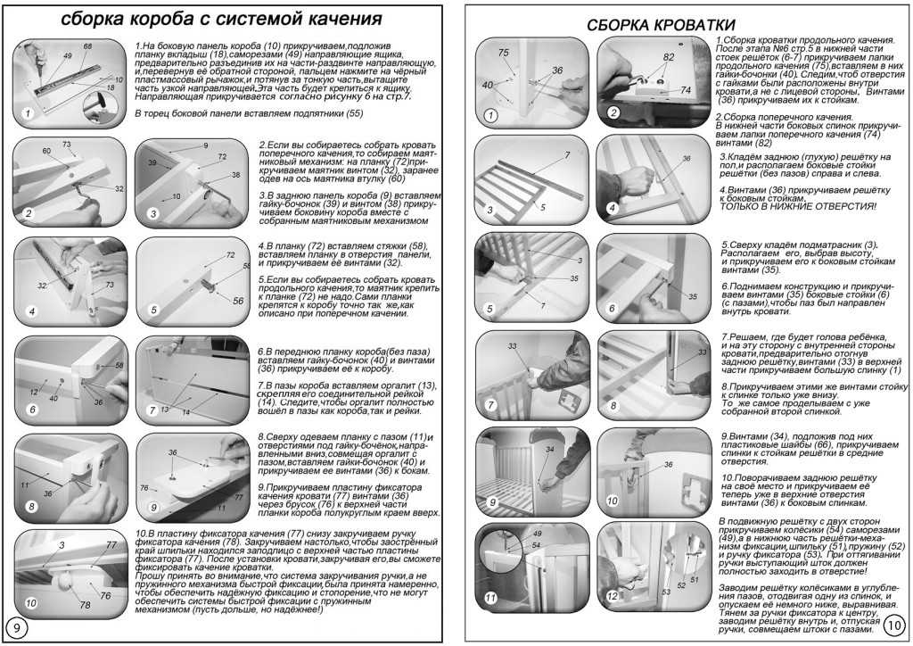 Кроватки обеспечивают монотонные плавные покачивания, которые способствуют быстрому засыпанию детей. Спальное место обычно имеет два уровня, обладает ортопедическими свойствами. Правила сборки таковы: