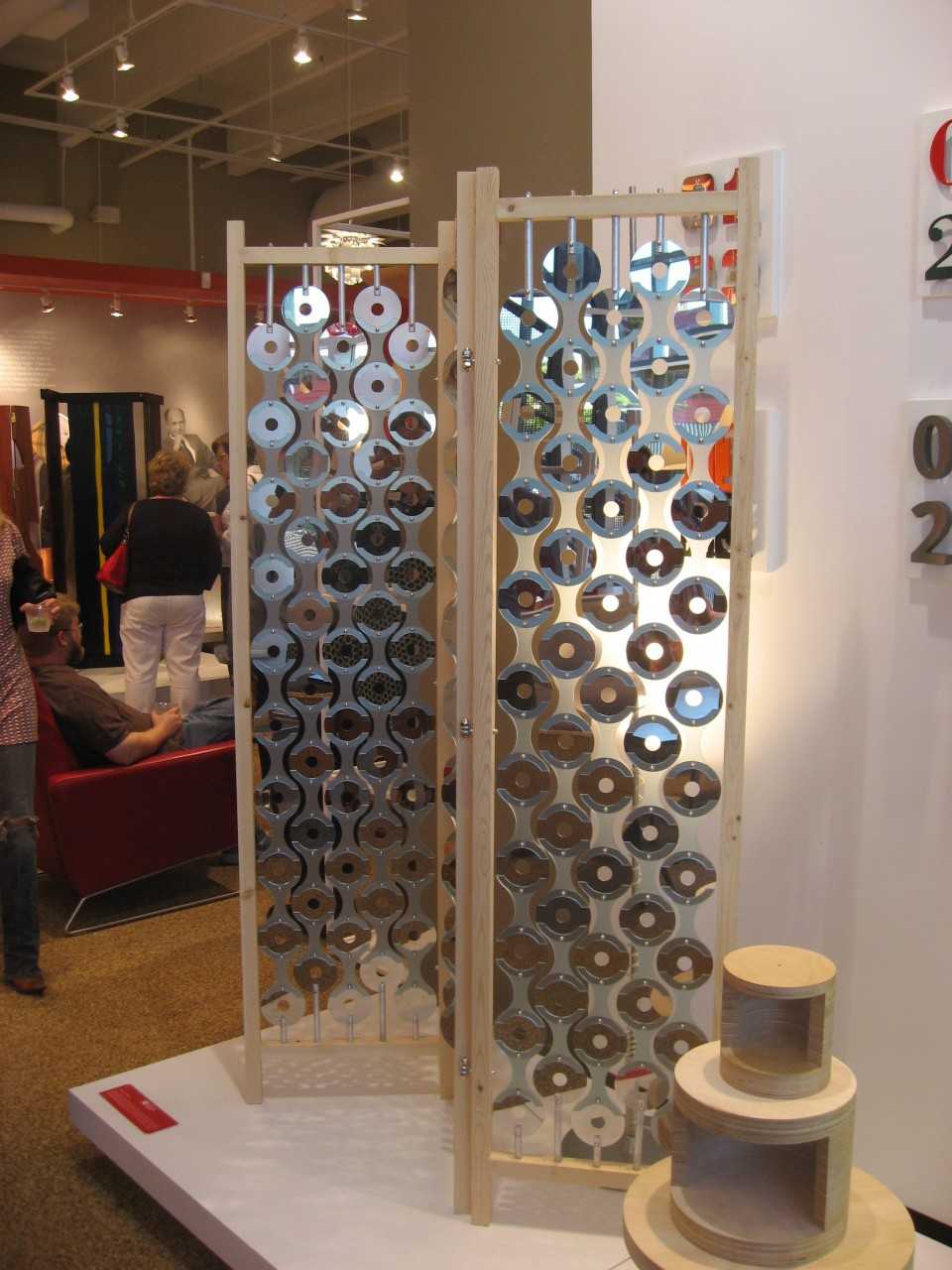 Почему бы не преобразить старенькое стекло на двери, возможно давшее трещину, кусочками дисков. Результат получается очень интересным.