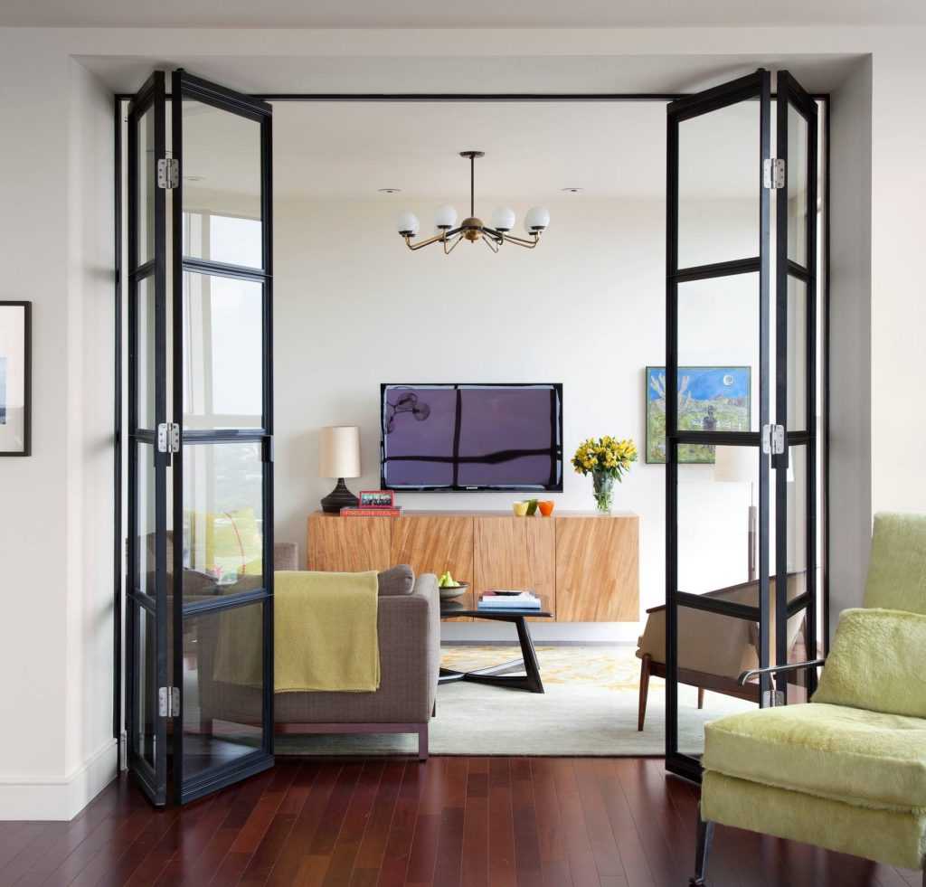 При установке двери-книжки из стекла важно заранее позаботиться о безопасности. Оптимальный вариант – триплекс или закаленное стекло