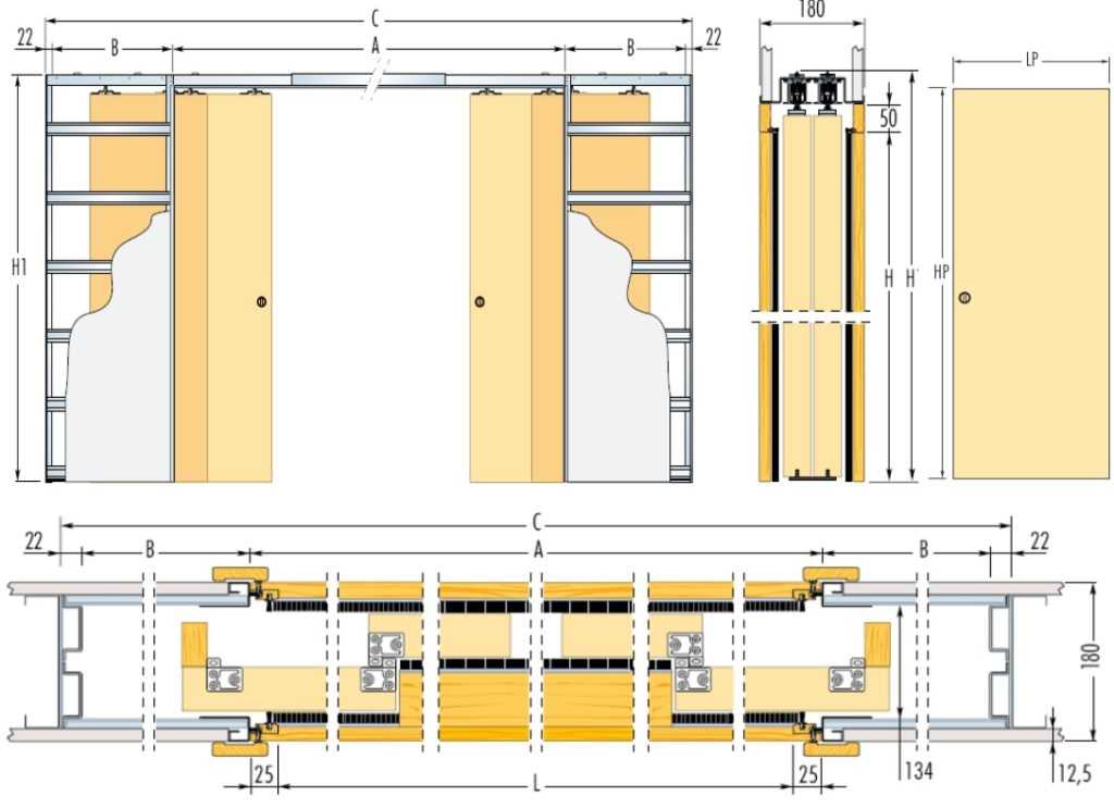 Межкомнатные двери пенал представляют собой встроенные системы, которые состоят из одного или нескольких полотен. К ним прикрепляются две роликовые кассеты. Эти детали необходимы для того, чтобы полотна могли перемещаться по треку (направляющей). Изготавливаются они из алюминия или стали.