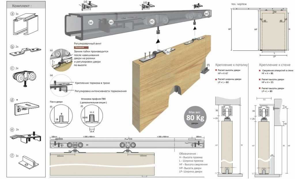 Несмотря на то, что составы комплектов могут отличаться, в общем случае они включают в себя: роликовую пружинную систему для фиксации дверного полотна в верхней направляющей, опорные ролики или колеса для установки двери на нижний рельс, фиксаторы и ограничители хода двери