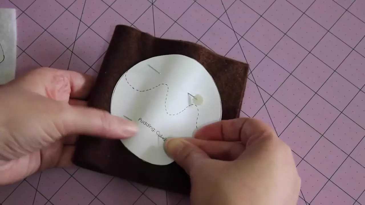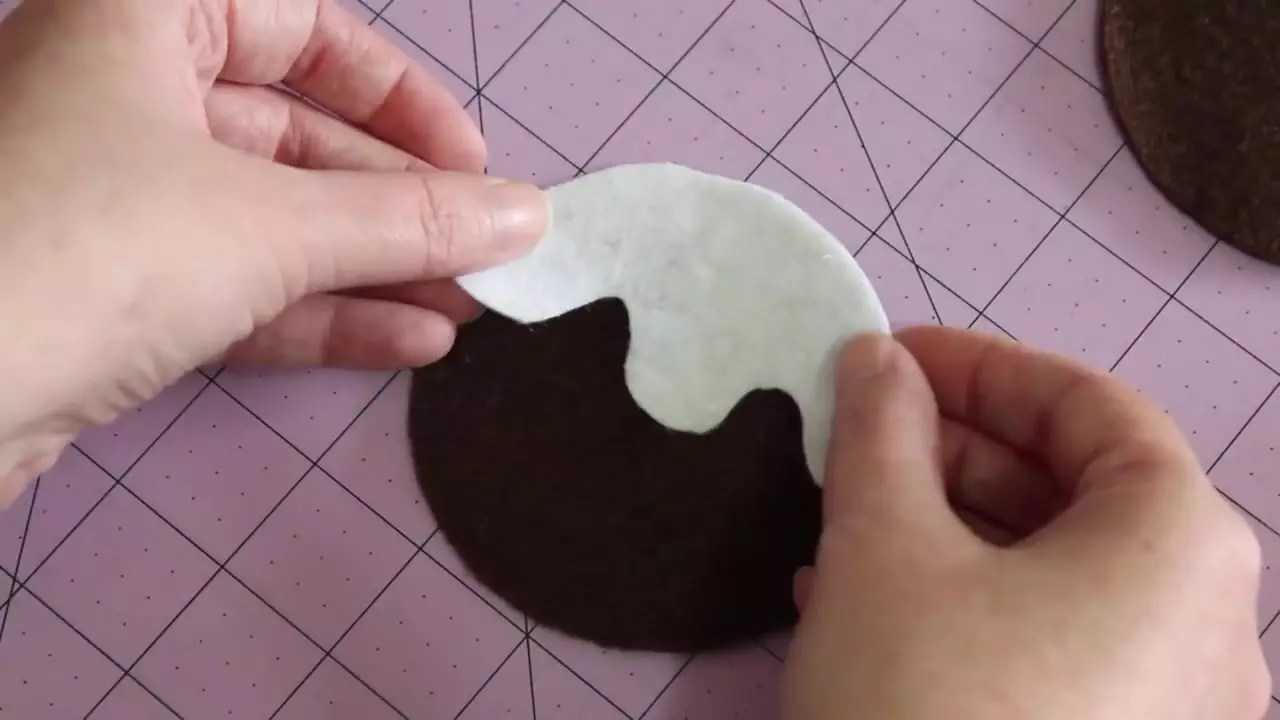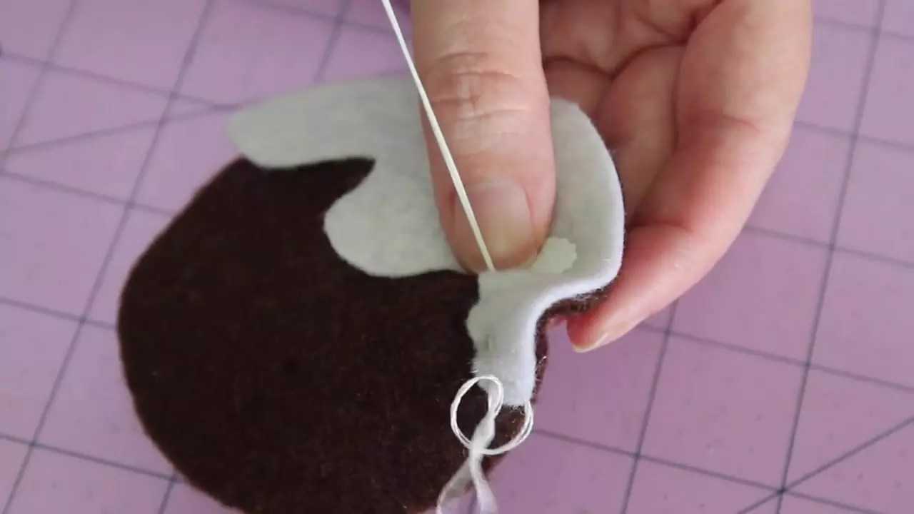 Сложите ленту в форме петли, надежно пришейте к одному кружочку коричневого пудинга. Это будет верхняя часть вашего украшения. Не обязательно использовать коричневые нитки в тон фетра, так как все швы будут скрыты.