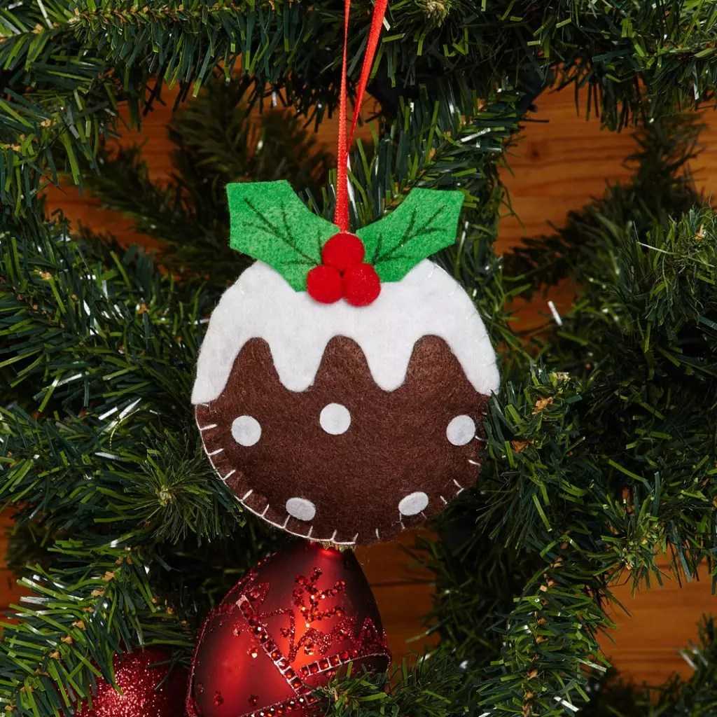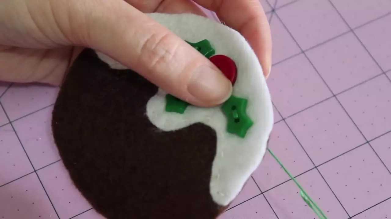 Попробуйте добавить черные блестки, бисер или, может быть, маленькие кружки из черного фетра на коричневой пудинг, чтобы получились кусочки фруктов. Вы можете использовать маленькую красную пуговку вместо красного фетра. Эта конструкция также будет забавно выглядеть в качестве новогодней броши – пропустите ленту, вместо установите булавку или иное крепление.