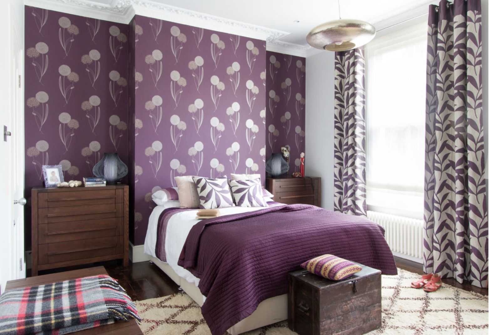 Любой из оттенков подходит для контрастного оформления обоями, в сочетании со светлыми цветами фиолетовый выглядит очень эффектно: