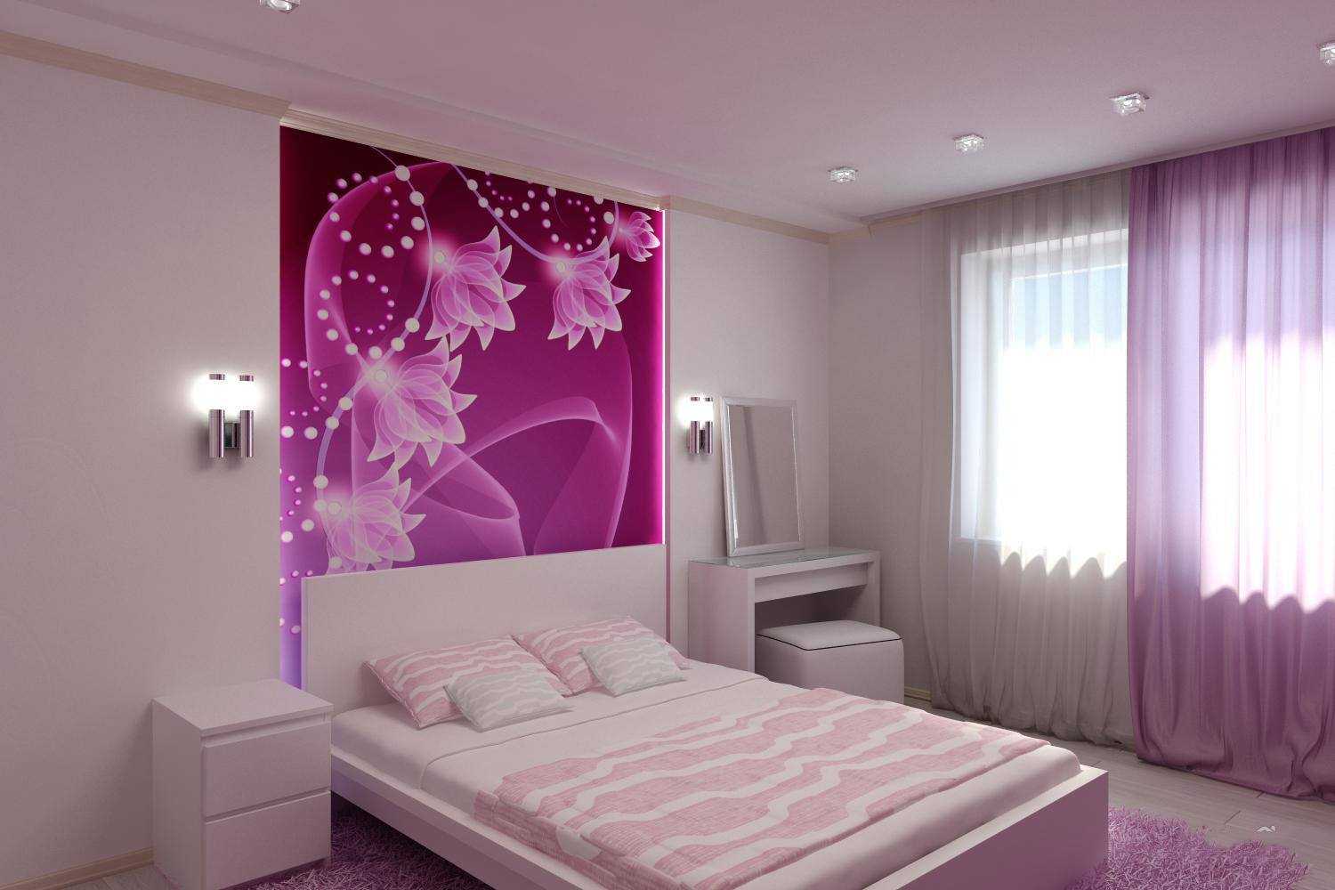Для этого нужно сделать максимально яркой и притягивающей внимание самую дальнюю стену. Можно использовать фотообои, просто яркий оттенок или любые аксессуары, которые будут уместны в сиреневой спальне