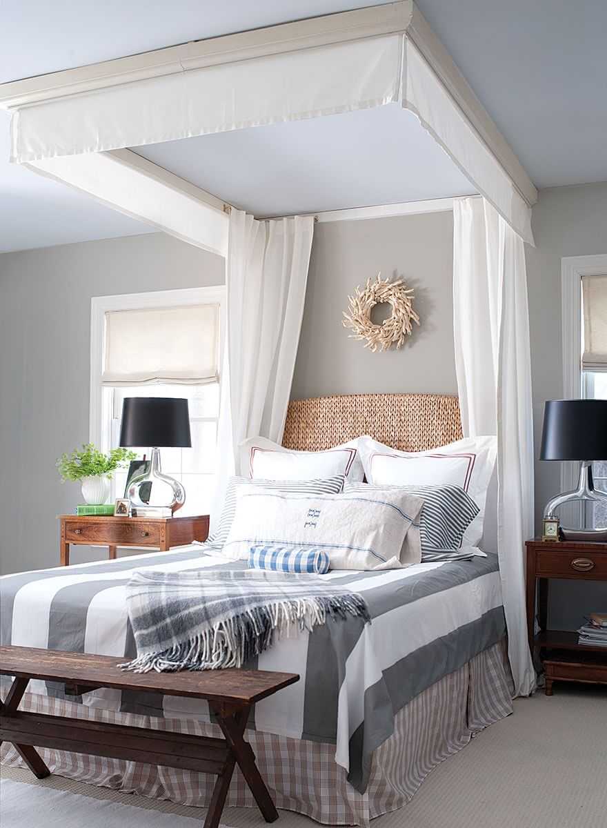 В спальнях может сочетаться классика и кантри. Здесь присутствует внушительная габаритная мебель, светлые пастельные тона и уютный текстиль. Для спального места характерно наличие высокого изголовья и банкетки со стороны ног. С двух сторон от изголовья размещаются две прикроватные тумбочки, оснащенные выдвижными ящичками и светильниками – настольными или бра. Для размещения постельного белья и одежды стоит предусмотреть комод, а если пространство позволяет – вместительный шкаф-купе или гардеробную. В современные интерьеры органично вписываются плетеные кресла и кровати из металла.