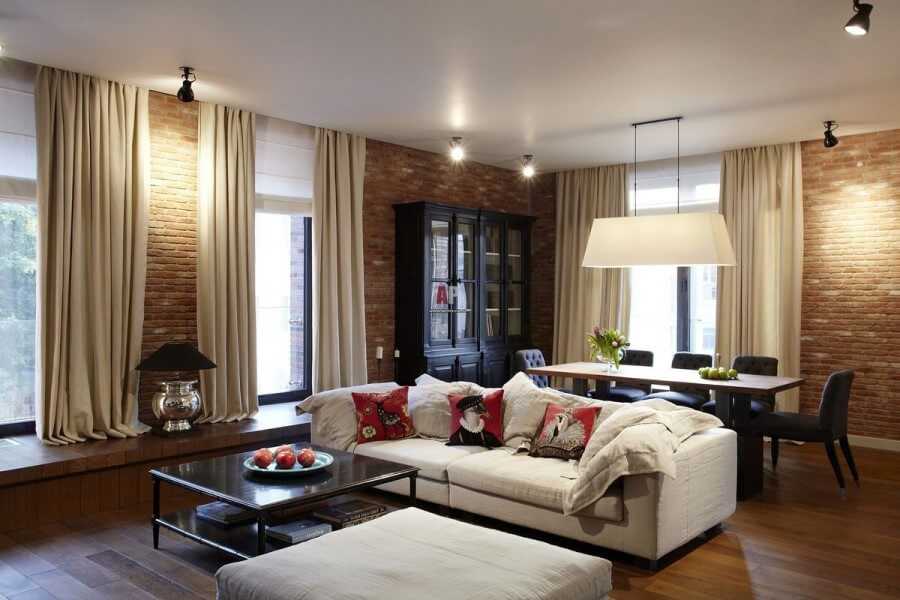 Здесь преобладает акцент на приглушенный свет и обязательное наличие разной мебели. Это могут быть не только пуфики, но и тоже самые журнальные столики и дополнительные декорации. Шкафы чаще всего встраиваются в стены, а на окна вешают небольшие шторы.