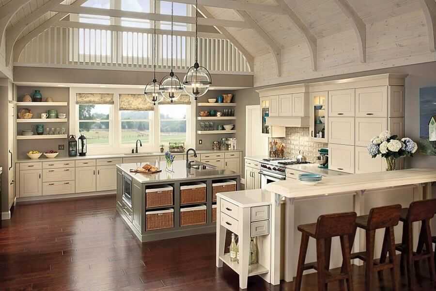 Американский стиль предпочитает простую форму потолка. Поверхность под побелку или покраску дополняет геометрическая лепнина. В просторной гостиной и на кухне используют потолочные балки. Декоративные элементы подчеркивают размеры помещения, помогают разделить пространство на функциональные зоны.