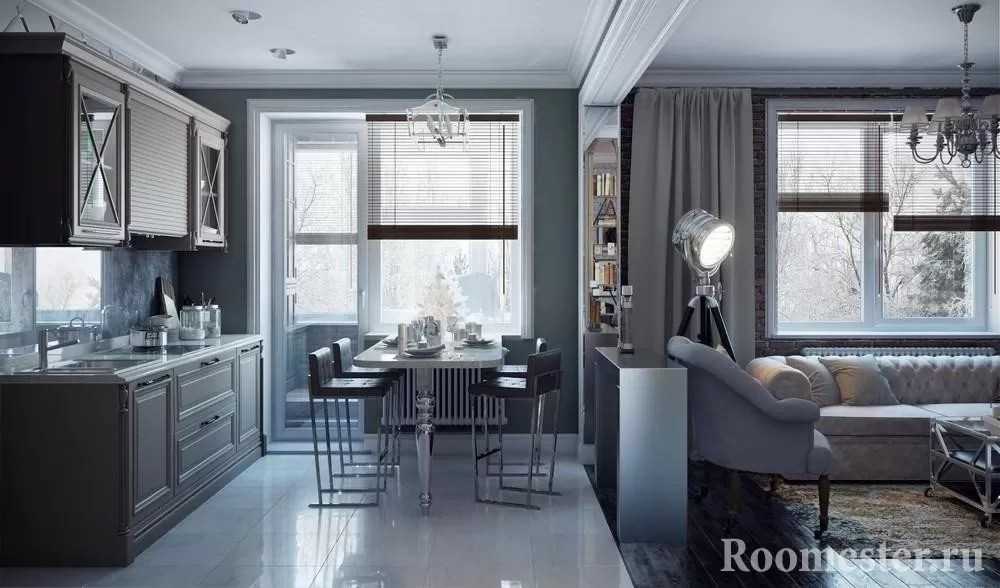 Американский стиль – отличный выбор для просторной кухни. В двухкомнатных квартирах пищеблок должен быть объединен с гостиной. Прием зонирования позволяет визуально отделить пространство готовки от обеденной зоны. Можно использовать легкие невысокие перегородки, стеллажи со сквозными полками, раздвижные панели. При желании можно просто развернуть диван спинкой к кухонной зоне. Другой вариант – отгородить его с помощью комода, на котором будут размещены комнатные растения.