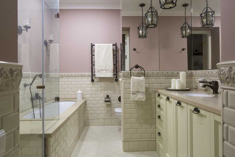 Необычно выглядят дизайн-проекты, где на поверхности стен выложена мозаика. Популярными цветами оформления ванной стали зеленый, бежевый, нежно-розовый, голубой.