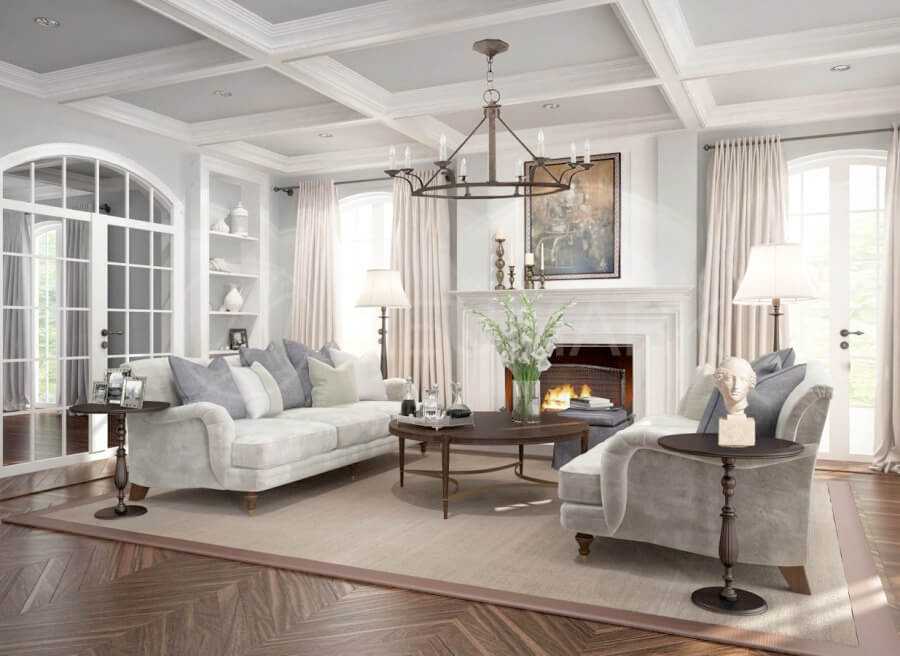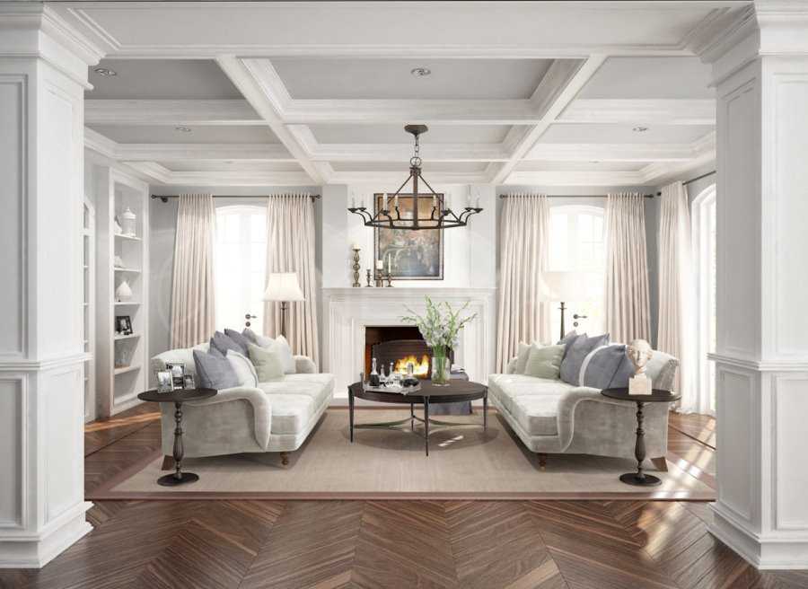 Для отделки потолков современный американский интерьер предусматривает следующие виды оформления: