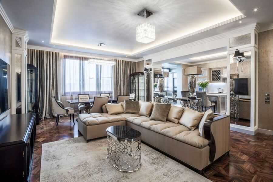 При оформлении просторного помещения нельзя забывать про хорошее освещение: при оформлении потолка можно использовать различные варианты осветительных приборов (от массивных люстр до миниатюрных встроенных светильников).