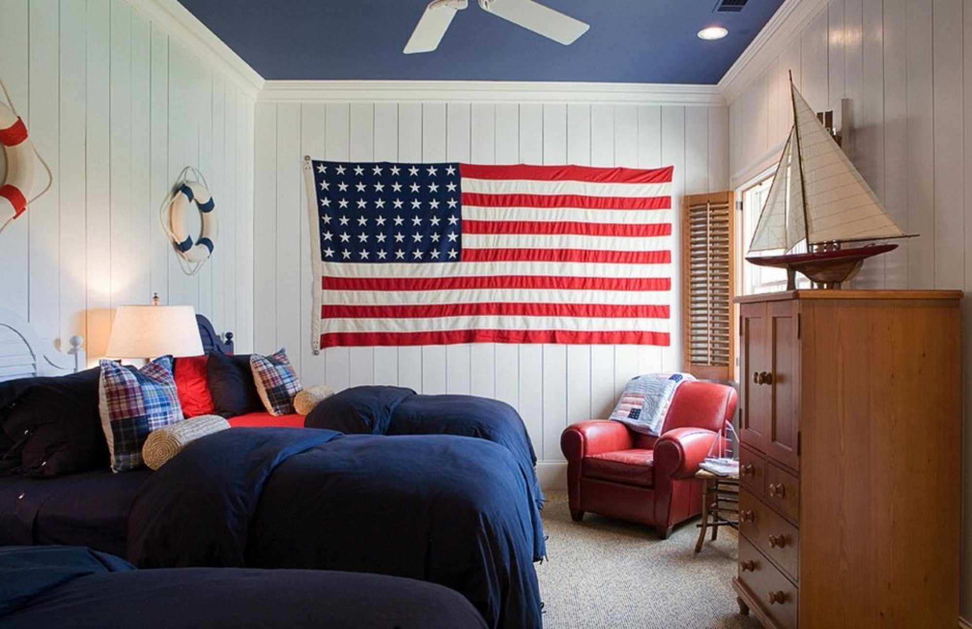 Другое популярное решение – яркое сочетание цветов американского флага: красного, синего и белого. Чтобы сделать интерьер более спокойным, такой выразительный союз сглаживают нейтральным белым фоном. Сюда же можно добавить характерные звезды и полоски в качестве акцентов. Получится стильный, освежающий интерьер, который при этом не утомляет.