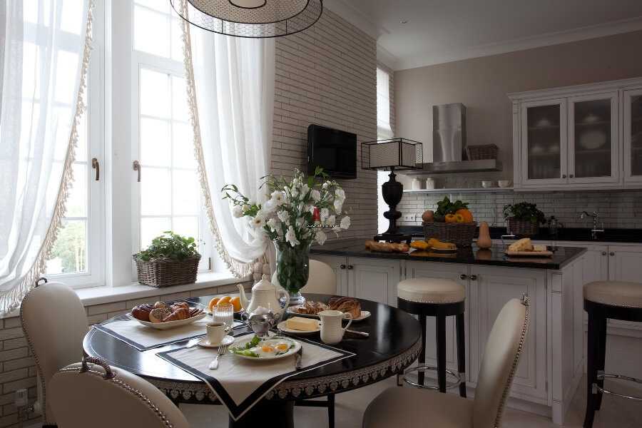 Необязательным, но желательным условием считается наличие островного гарнитура, оборудованного варочной плитой, мойкой или просто рабочей поверхностью. Приветствуются барные стойки. Самое популярное расположение гарнитура – П-образное. Вся техника на кухне встроенная. Над плитой оборудуют массивную вытяжку.