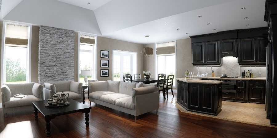 Эти особенности едины для разных вариантов жилья: от коттеджа до городской квартиры. Чтобы визуально увеличить пространство, убирают все перегородки и сносят лишние стены. Мебель или разнородная отделка служат для зонирования большой площади.