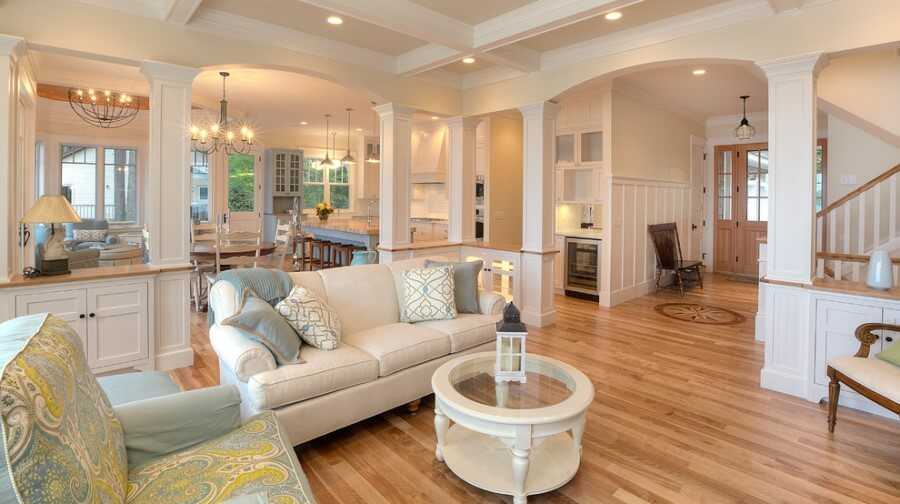 Объединение и зонирование пространства. Интерьеры американских квартир, домов и усадьб часто включают в себя всевозможные арки, псевдо перегородки, ниши, которые служат не только условным разделением комнат и пространства в целом, но и местом для хранения разных мелочных предметов.