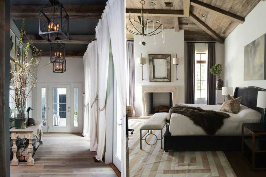 Дизайн лучше раскрывается в интерьере коттеджа. На первом этаже объединенные пространства напоминают студию. Прихожая часто переходит в гостиную, а столовая в кухню. В хозяйственных помещениях располагают: