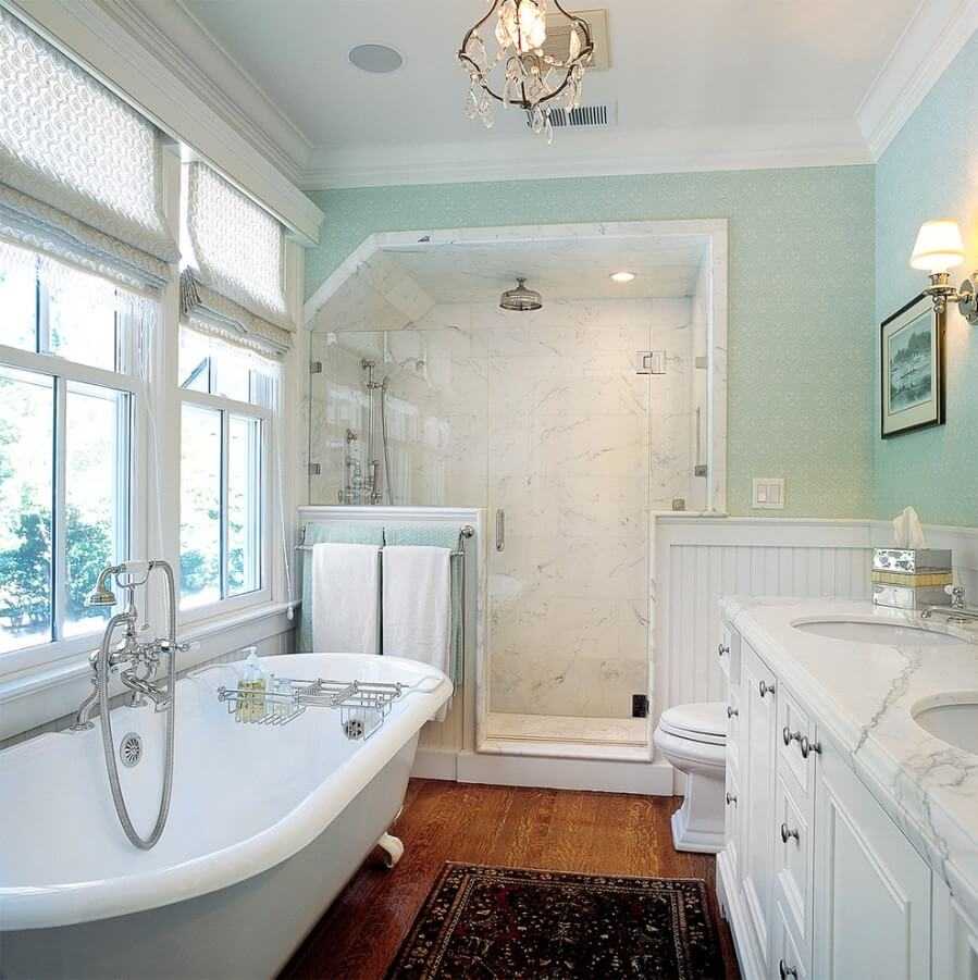 Внушительный размер – это главная черта американских ванн. Она может совмещать в себе не только классическую ванну, но и габаритную душевую кабину. Отдельный акцент делают на декорации. Даже в таком помещении могут встречаться картины с соответствующей тематикой, плафоны для освещения и даже вазы с цветами.