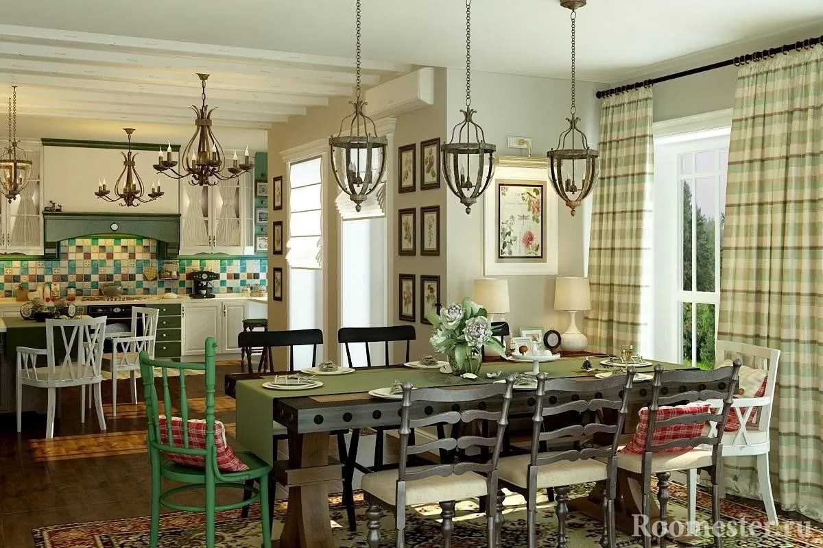 Рациональное использование пространства наряду с зонированием подразумевает, что процесс приготовления пищи будет отделен от столовой зоны, но не стеной. Используют легкие низкие перегородки, аксессуары, предметы мебели, отделочные материалы. Освещение должно быть разноплановым. Каждая отдельная зона освещается индивидуально. Над обеденным столом нередко вешают большую люстру.