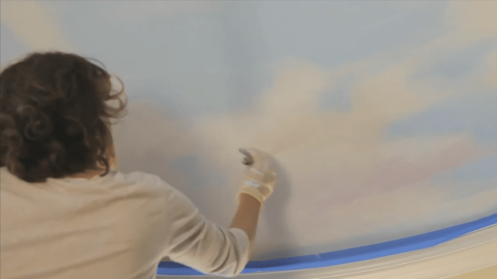 Комнатный небосвод нужно покрыть синей краской два раза, чтобы не было видно разметки. Затем заняться прорисовкой облаков. Понадобится вода, чтобы сделать границы размытыми, естественными. Пористость облакам можно придать с помощью губки. Для этой работы подойдет поролоновая губка с узорной текстурой. Синтетическую тоже можно использовать, но поскольку этот материал более плотный, то нужную форму создают, слегка подрезав синтетическую губку ножом или ножницами. С помощью спонжинга, облака получатся почти настоящими. Технология такая: губку обмакивают в краску и аккуратно промокают поверхность.