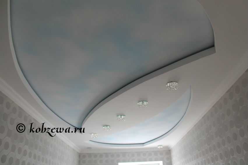 В завершении нижний ярус потолка и плинтуса покрасила валиком+ кистью в белый цвет в два слоя. После были установлены точечные светильники, и вмонтировала в углубления светодиодная подсветка именно голубого цвета, чтобы подчеркнуть синеву неба. На самом деле нарисовать голубое небо с облаками на потолке из гипсокартона не так уж и сложно, главное иметь краскопульт, терпение и желание.