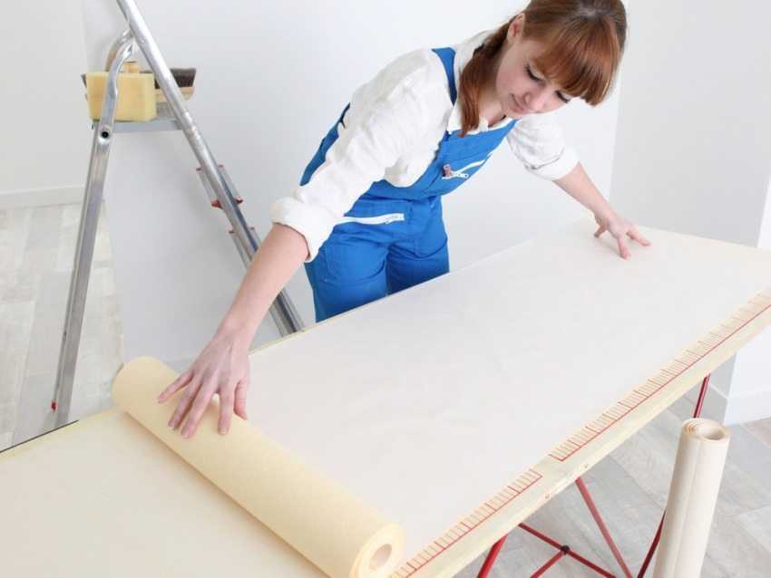 Перед проведением основных работ рулонные материалы разрезают на полосы, длина которых соответствует высоте стены плюс запас в 5–10 сантиметров. Для большей точности высоту комнаты проверяют в разных местах. В случае совпадения размеров нарезают несколько полос, суммарная ширина которых позволяет перекрыть всю плоскость стены.