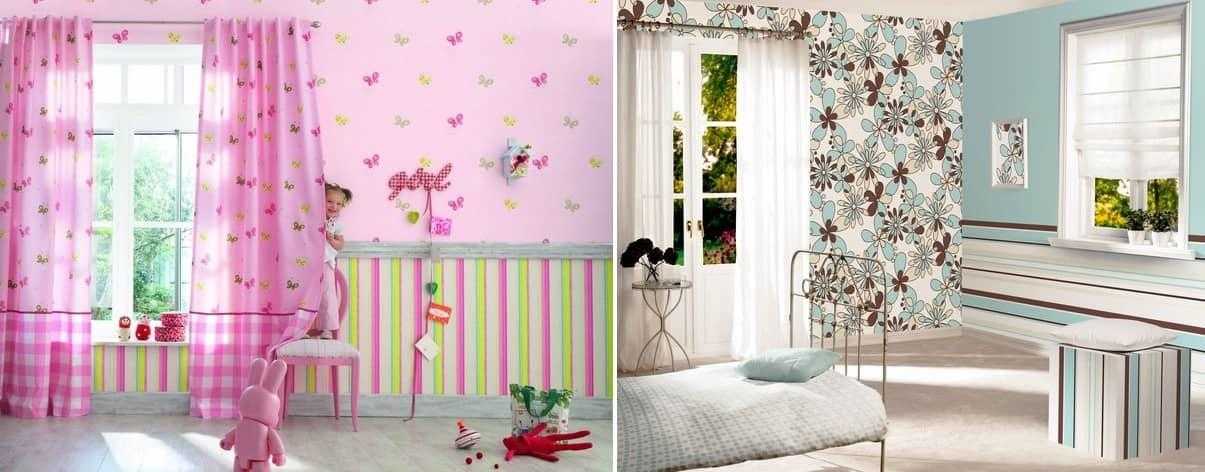 Отдельно рассмотрим современные направления дизайна в поклейке обоев. Одним из модных и популярных стилей является декорирование комнат обоями двух видов. Совмещение нескольких фактур и цветовых оттенков позволяет сделать интерьер помещения весьма оригинальным.