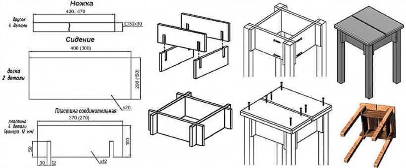 Начнем с того, что даже стандартные конструкции могут собираться из разного количества элементов. К примеру, табурет из четырех частей. В ее состав будут входить сиденье, две ножки-боковины и перекладина, основное назначение которой – фиксация боковин для придания конструкции устойчивости.