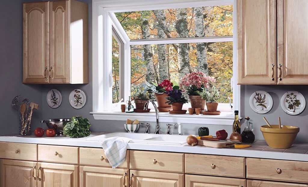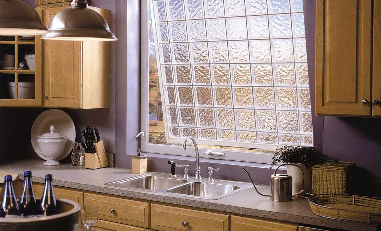 Если кухонная комната содержит рабочую поверхность с мойкой перед окном, использование традиционных текстильных штор или занавесок неуместно. Общий интерьер в таком случае должен подчеркивать окно как эстетический элемент.