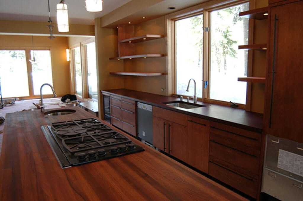 Оригинально будет смотреться размещение разделочного стола по центру комнаты.