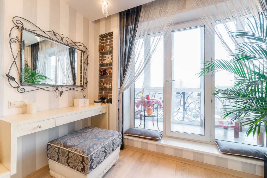 Отличительная черта конструкции – наличие панорамных окон. Они выглядят эффектно и прекрасно сочетаются с парапетом на лоджии. Открывается хороший обзор на улицу и ее пейзажи. Пусть даже городские. Комната будет значительно светлее.