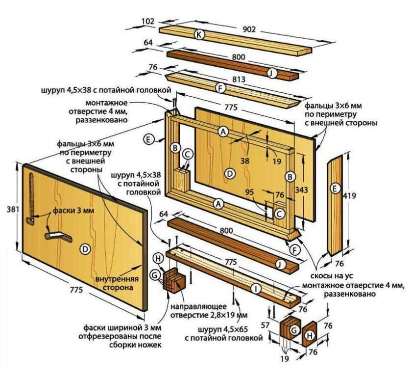 - Далее сделайте панели D — 19x775x381 — 4 шт. С лицевой стороны всех четырех деталей по всем краям сделайте фаску 3×6 мм.