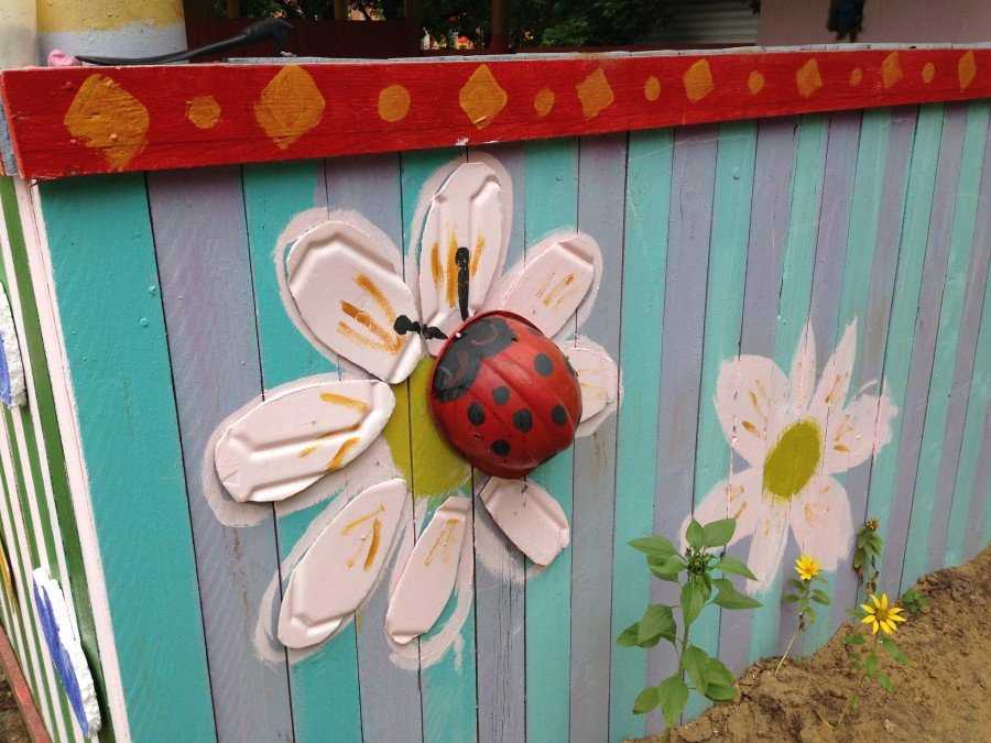 А вот из крышек букашечки получаются очень компактные. Цветных малышей размещаем на открытых горизонтальных и вертикальных поверхностях: на заборе, стене дома, стволе дерева, здесь они будут смотреться великолепно. А вот в траве и на клумбе затеряются. К поверхности их можно приклеить либо прибить гвоздиками.