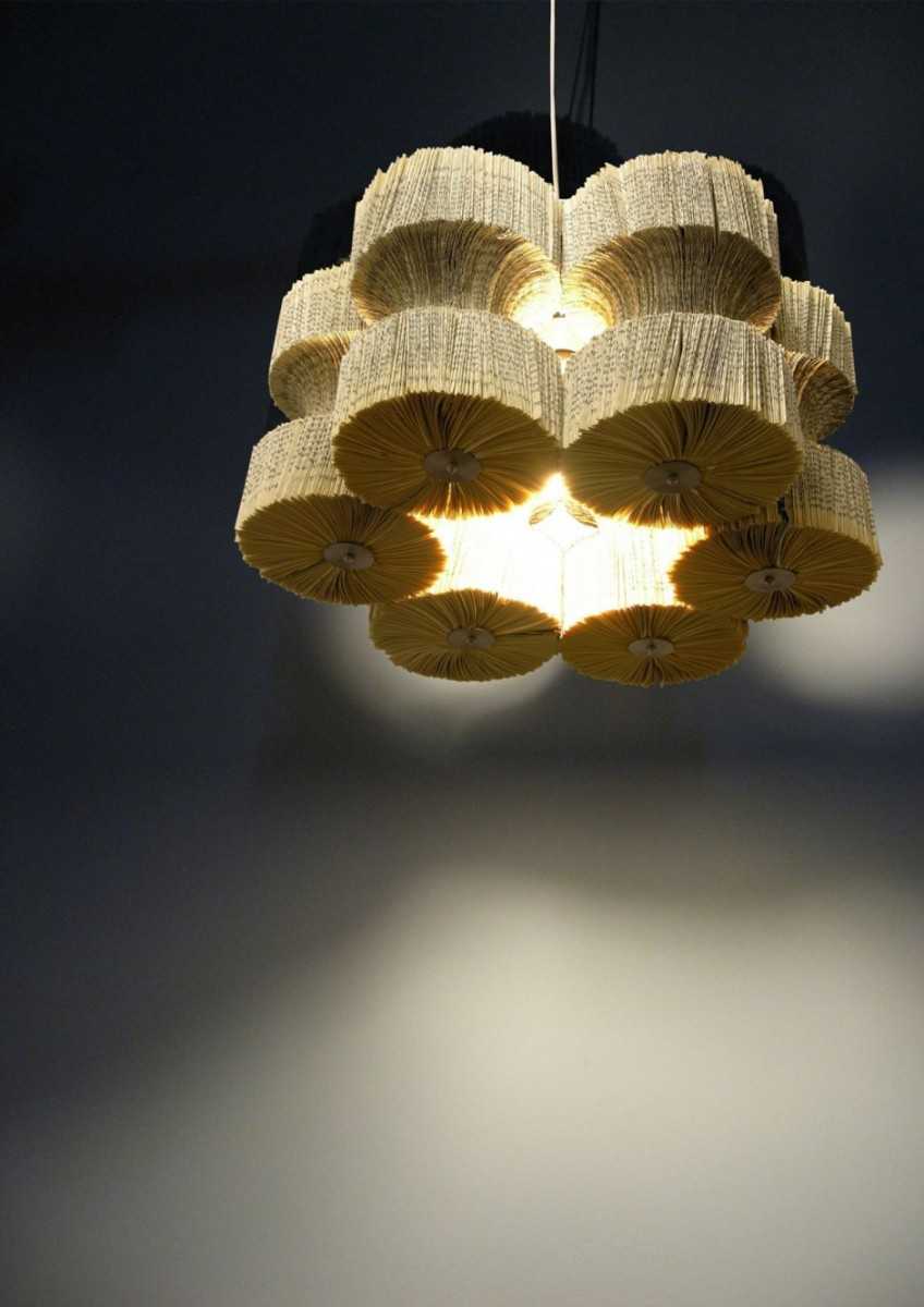 Это обеспечит надежность конструкции. Интересным вариантом могут быть соединенные между собой старые книги, установленные на основу. В центре делается отверстие, через которое пропускается штанга. После этого крепится плафон с патроном.
