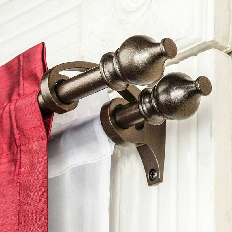 Чтобы примерить двухрядный карниз, прежде чем его окончательно установить, положите трубу параллельно окну, на которое собираетесь вешать. Теперь, его надо частично собрать – надеть кронштейны и декоративные наконечники