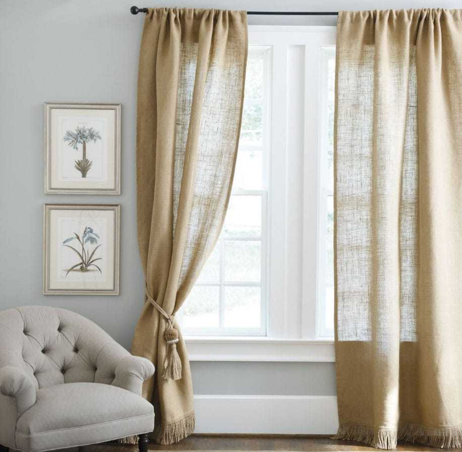 Деревенский стиль для частного дома с точностью повторится, если шторы из мешковины своими руками облагородить вышивкой или декоративной канвой в украинских или русских мотивах. Кроме этого, края не подшиваются, а украшаются бахромой.