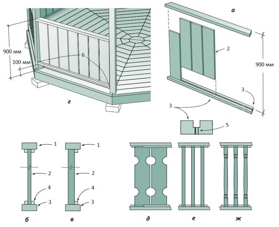 Конструкция и установка ограждений по периметру беседки: а — в — варианты сборки филенчатых щитов; г — установка щитов между столбами; д — ж — варианты оформления (резная доска, брусок, точеные балясины); 1 — перила; 2 — филенки; 3 — нижние опоры; 4 — бруски крепления филенок; 5 — дренажное отверстие; 6 — пазы в столбах.