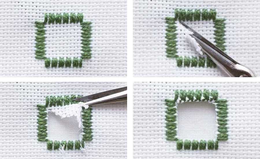 Для некоторых техник вышивки ткань нужно продёрнуть, то есть удалить нити утка на определённом участке основы.