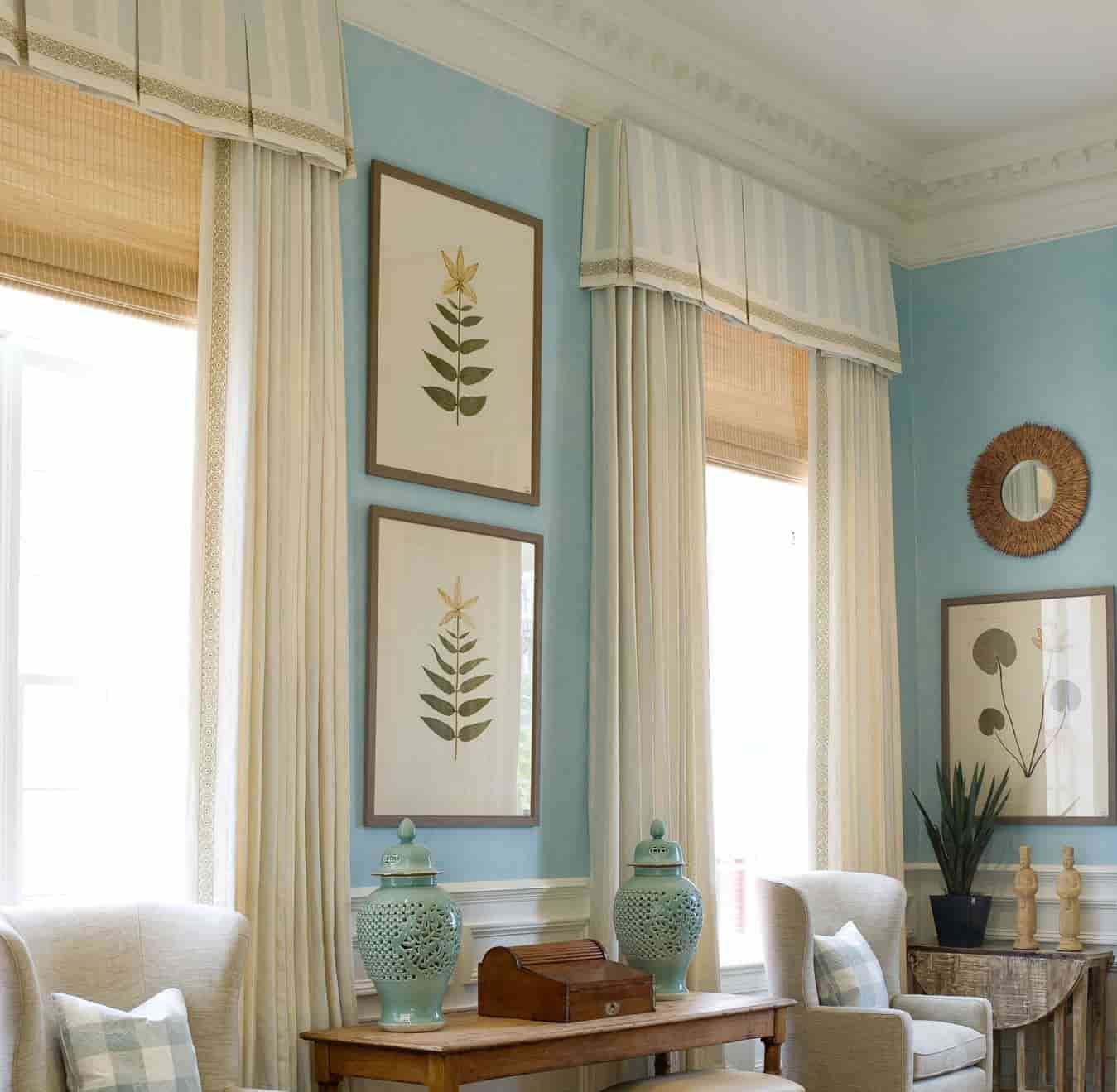 Например, в просторном и светлом помещении с высоким потолком уместны роскошные тяжелые шторы с подхватами и ламбрекен с пышными драпировками. Если комната имеет скромные размеры, больше подойдут тюлевые занавески с незамысловатым ламбрекеном из мягких тканей.