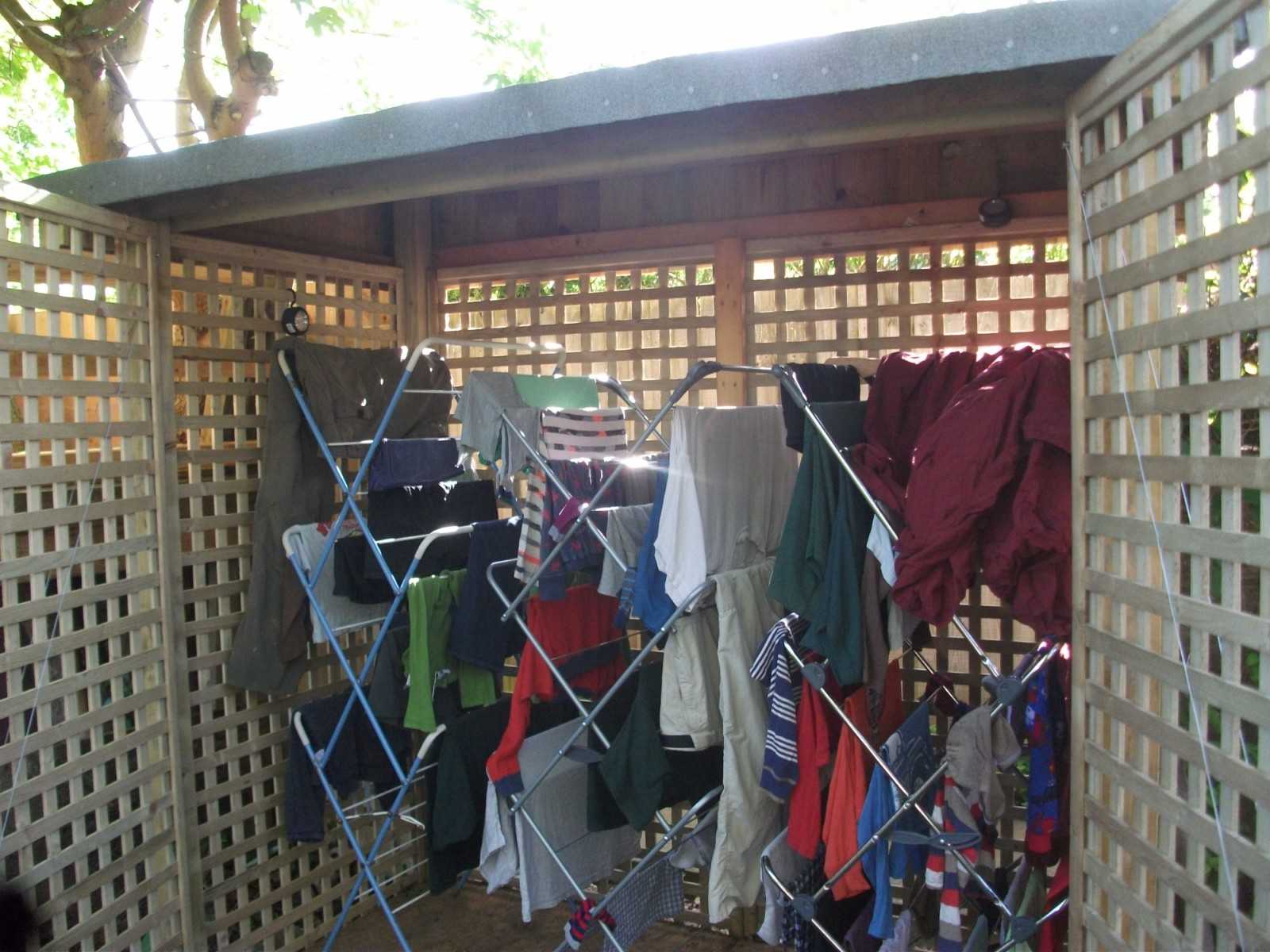 Для такого варианта подойдет любой уличный навес или пергола. Под крышей натяните веревки или закрепите крючки для нескольких вешалок. «Домик» хорош тем, что сушить белье можно во время дождя или снега. Он обдувается со всех сторон, белье имеет постоянный доступ к свежему воздуху и скрыто от палящих солнечных лучей. А вешалка не позволит одежде примяться.