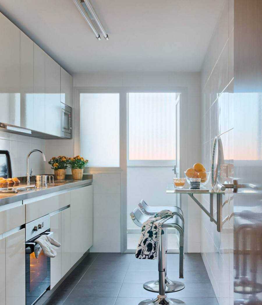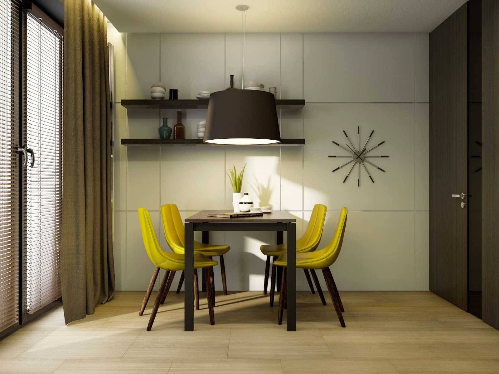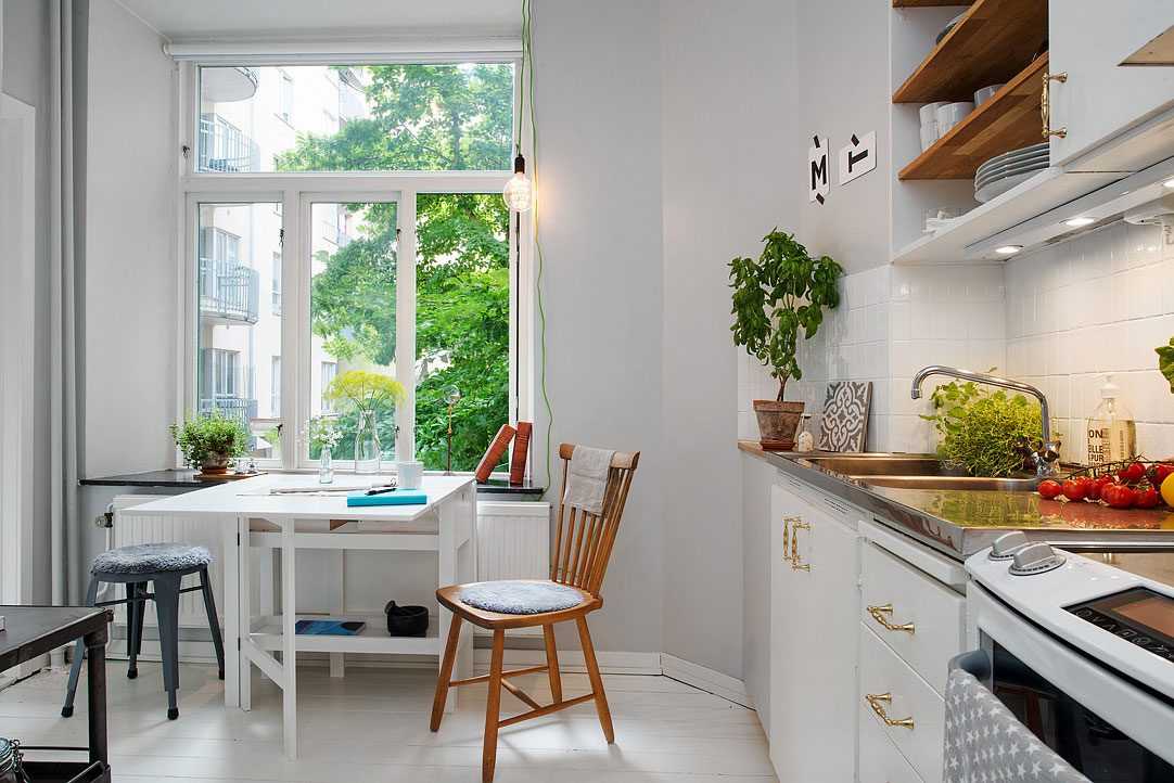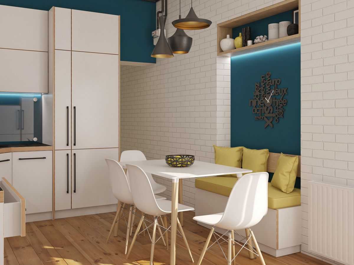 Если семья состоит не более, чем из двух человек, то для обеденной зоны можно выделить место на кухне. Например, переделанный в столешницу подоконник. К нему необходимо купить барные стулья, а лучше – барные табуреты, которые полностью задвигаются под столешницу, освобождая больше места.
