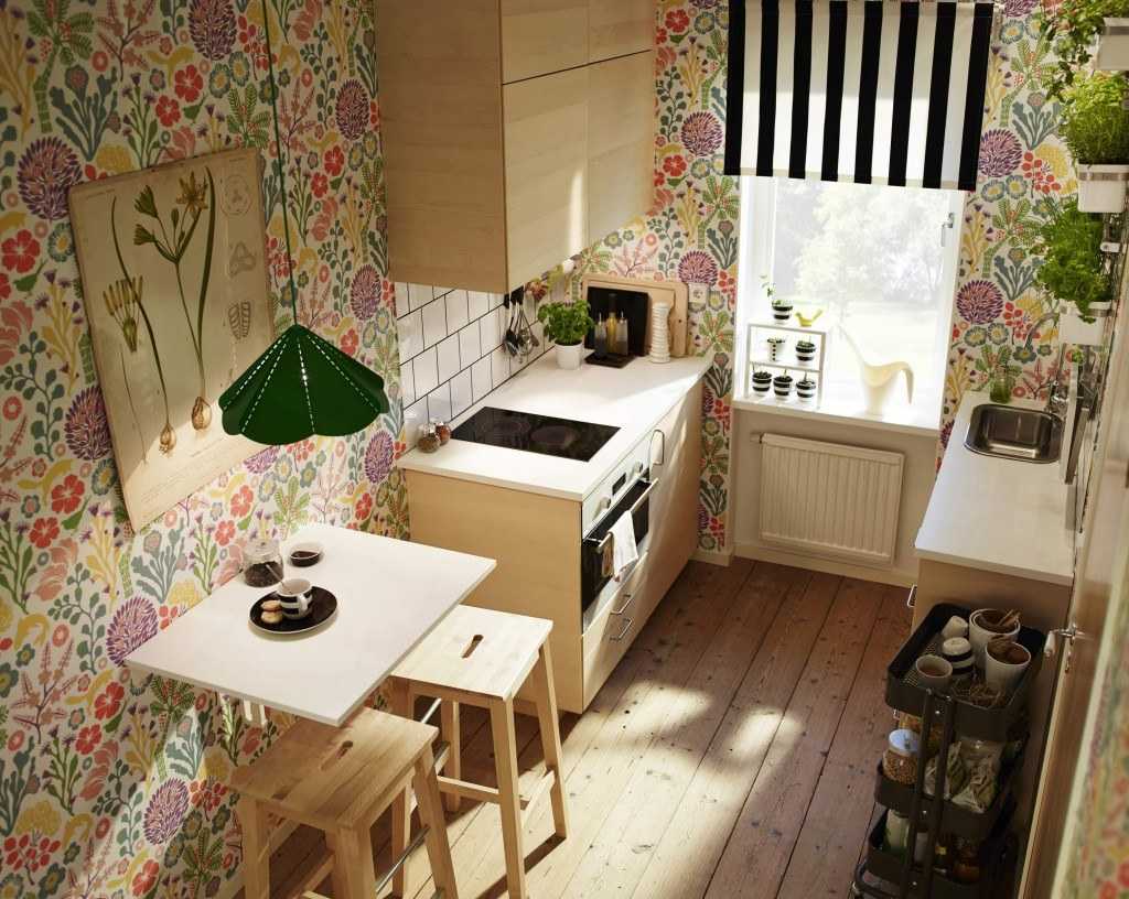 Также следует избегать контрастных узоров, крупных рисунков и вертикальных полос, так как они «съедают» кухонное пространство, делая и без того небольшую комнатку еще меньше. Зато светлые обои с золотистым или серебренным мелким рисунком (обычным или выбитым) будут смотреться великолепно.