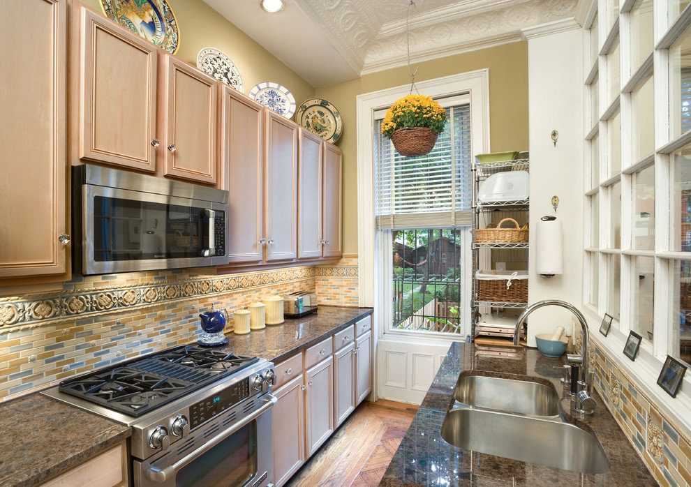 Классика показывает безупречный вкус и приверженность традициям. Такой интерьер чем-то напоминает дома знатных дворян или купцов: деревянные гарнитуры, покрытые лаком или светлой эмалью молочных оттенков; золотисто-серебряные акценты; гипсовая лепнина; высокие мягкие стулья; атласные гардины. Подобрать кухонную технику под стать дорогой мебели не составит труда — красиво декорированную плиту, вытяжку и холодильник можно купить в любом крупном магазине. Все это поможет забыть о советском прошлом квартиры и превратит ее в оазис роскоши.