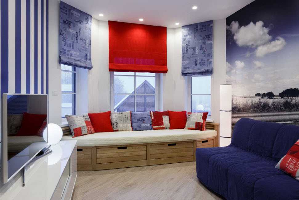 В минималистических интерьерах целесообразно занавесить скошенное окно римской шторой. При этом стоит учитывать тот факт, что полотно может подниматься только до уровня начала скоса. Аналогичного эффекта позволят добиться французские, австрийские занавески.
