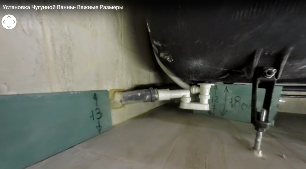 И получается если мы имеем 13 см по верхнему фланцу 50 трубы на входе от слива перелива ванны, то в среднем надо прибавить 5 см, это будет нижняя часть самой устанавливаемой чугунной ванны.