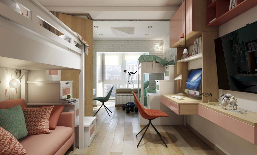 В маленькой комнате рекомендуется поставить двухъярусную кровать, чтобы максимально освободить пространство. Если возникнут какие-либо трудности или споры между детьми, необходимо все урегулировать заранее, до начала ремонта, во избежание ссор и претензий в будущем.