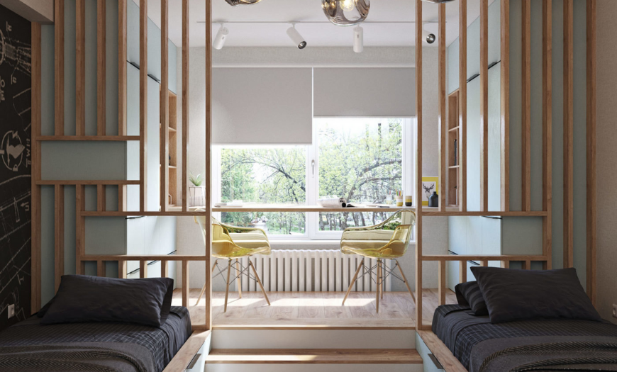 Даже в небольшой комнате придется разделять площадь на отдельные зоны, чтобы каждый ребенок чувствовал себя комфортно и имел личное пространство. Помогут в этом перегородки в виде стеллажей, шкафа или ширм.